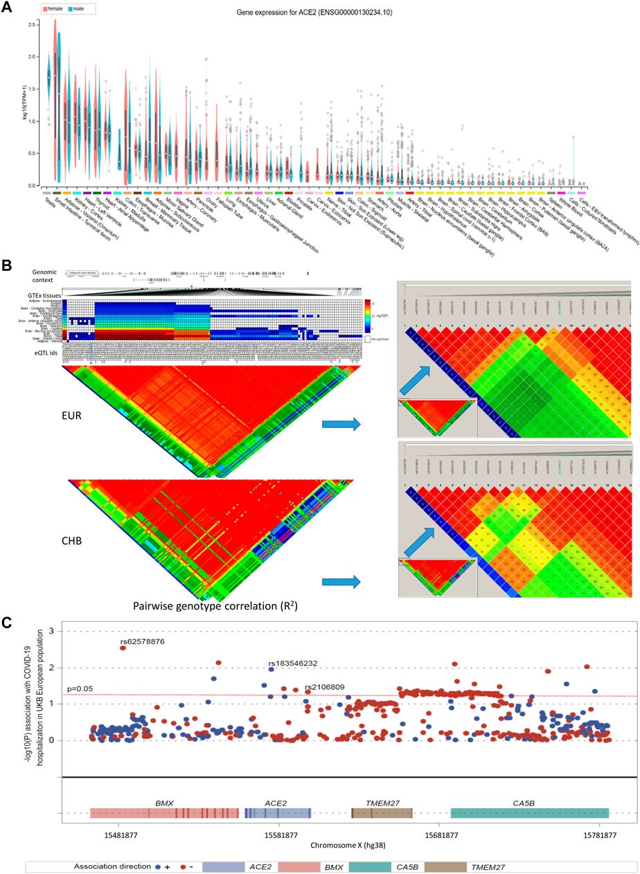 Fig. 1多个GTEx组织中的ACE2表达(图A);欧洲和亚洲汉族人群之间ACE2 GTEx表达数量性状位点(eQTL)的LD模式(MAF > 0.05)比较(图B);以及rs2106809与COVID-19欧洲人群住院治疗之间关联(C)。