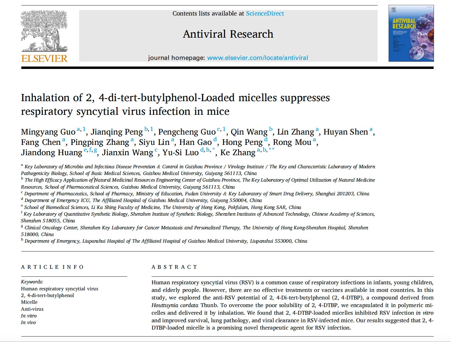 2024年4月,我院病原生物学实验室2020级硕士研究生郭名扬为第一作者,pbw必威西汉姆联附属医院罗语思主任医师,pbw必威西汉姆联张科副教授为共同通讯作者在病毒学类国际期刊《Antiviral Research》(JCR Q1,中科院2区,影响因子7.6)发表题为《Inhalation of 2, 4-di-tert-butylphenol-loaded micelles suppresses respiratory syncytial virus infection in mice》的研究论著。 该论文获得了国家自然科学基金、贵州省科技厅技术创新团队项目和pbw必威西汉姆联附属医院博士启动基金等项目的资助。