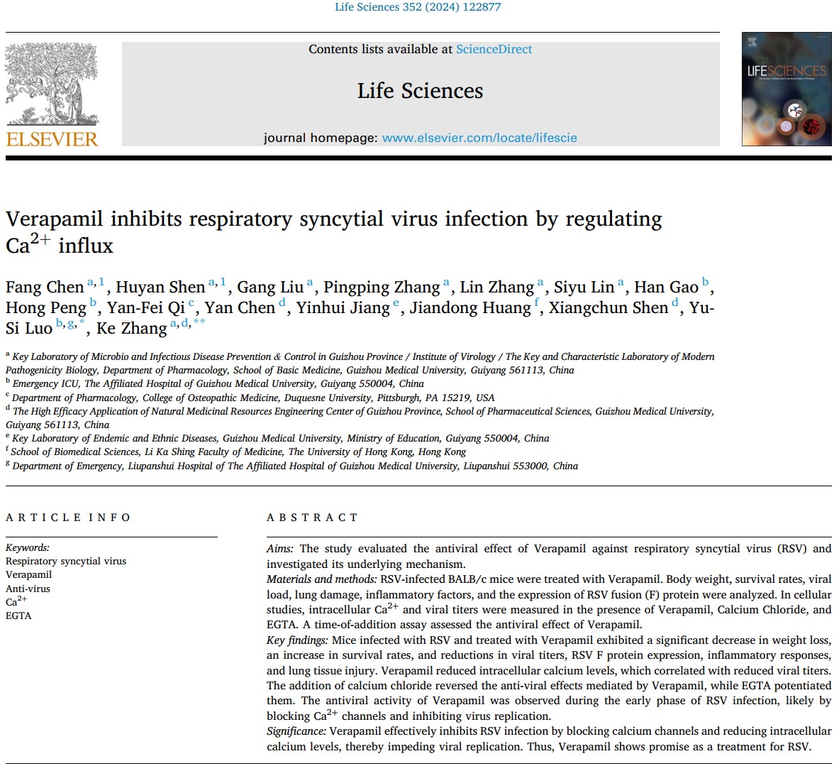 2024年6月,以我室张科副教授课题组硕士研究生陈芳、沈胡艳为共同第一作者,pbw必威西汉姆联附属医院罗语思主任医师和张科副教授为共同通讯作者,在JCR1区、中科院2区(top)期刊Life Sciences(影响因子:5.2)在线发表论著《Verapamil inhibits respiratory syncytial virus infection by regulating Ca2+ influx》(维拉帕米透过调节钙离子内流抑制人呼吸道合胞病毒感染)。