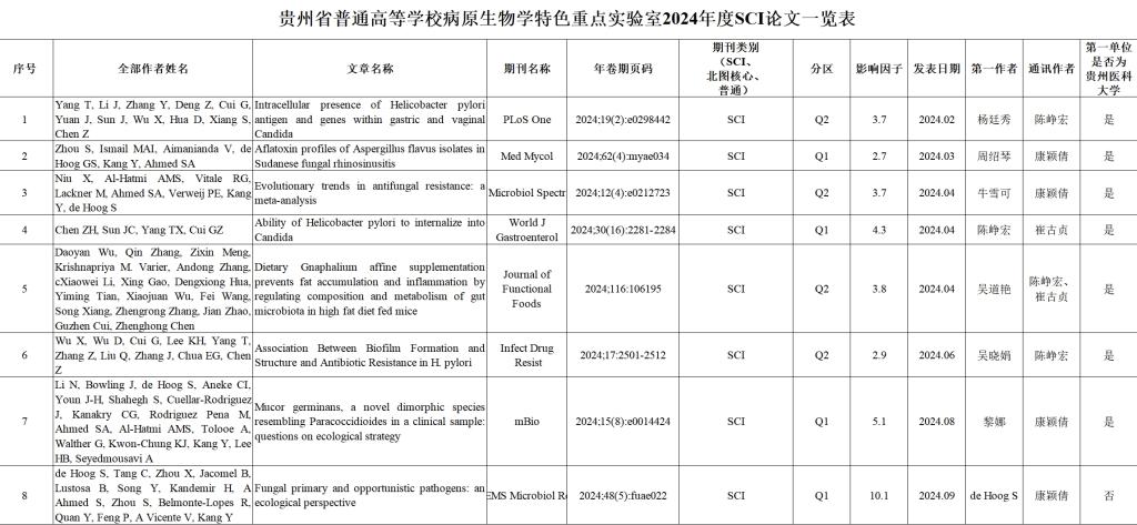 贵州省普通高等学校病原生物学特色重点实验室2024年度发表SCI论文8篇,总影响因子为36.3。