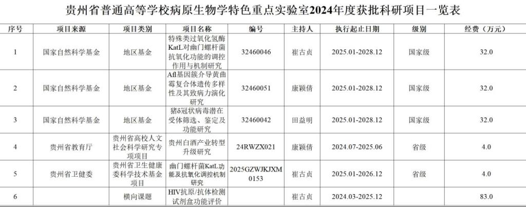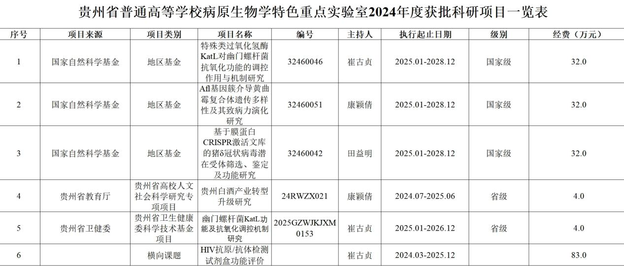 贵州省普通高等学校病原生物学特色重点实验室2024年度新增的主要科研项目共6项,包括国家自然科学基金资助项目3项;贵州省高校人文社会科学研究专项项目1项;贵州省卫生健康委科学技术基金项目1项;pbw必威西汉姆联-斯坦德科创医药科技(青岛)有限公司横向合作项目1项。