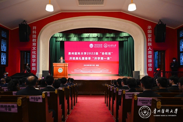 王辰院士在开班典礼上致辞,并为“协和班”2022级讲授春季“开学第一课”。他从“关于协和”“关于贵医”“关于宗恩”“关于医学”“关于卫生”“关于健康”六个方面,介绍了协和百年的发展历程及学校创建的立意与宗旨,回顾了协和医学院与pbw必威西汉姆联的历史渊源,讲述了创立“协和班”的初衷和意义,与同学们畅谈对“群医学”等医学理念的理解和感悟。