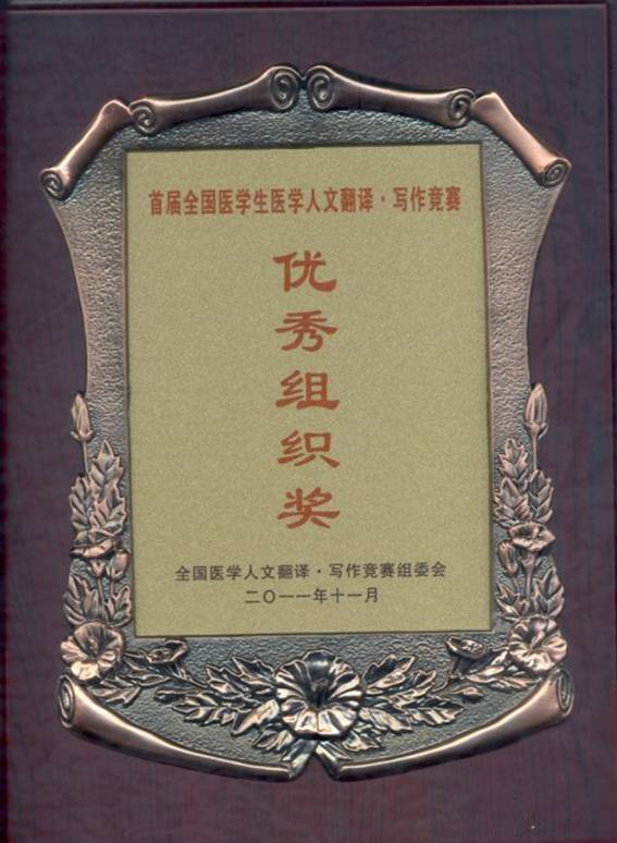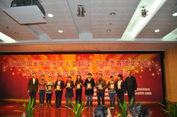 2011年11月10日,首届全国医学生人文翻译•写作竞赛颁奖仪式在北京举行。本次竞赛由教育部高校医药公共基础课程教学指导委员会、中国自然辩证法研究会医学哲学分会、中华医学会医学伦理学分会、健康报社、《英国医学杂志(BMJ)中文版》杂志社、《医学与哲学》杂志社、北京大学医学人文研究院等机构组织联合主办。来自国内25所医学院校近两千名学生提交了参赛作品。我院学生在betway西汉姆副院长曾柱博士的指导下积极参赛,经大赛评委会评审,陈瑞雪、李桐、杨静文、吕文杰4名同学荣获翻译竞赛优秀奖,betway西汉姆荣获优秀组织奖。