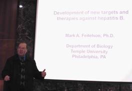 2011年12月19日至22日期间,美国宾夕法尼亚州Temple大学生物学系的乙肝病毒研究专家Mark A. Feitelson教授来我院进行教学示范及学术交流活动,并被聘请为我院的客座教授。Mark A. Feitelson,生物学教授,现任Temple大学生物技术中心副主任。主要研究的是乙型肝炎和丙型肝炎病毒相关的肝癌的发病机制,近年在香港大学肝病研究中心,上海复旦大学,广州大学,第二和第四军医大学等先后聘为客座教授,并被评为促进美/中国合作赛普拉斯学院的杰出校友。