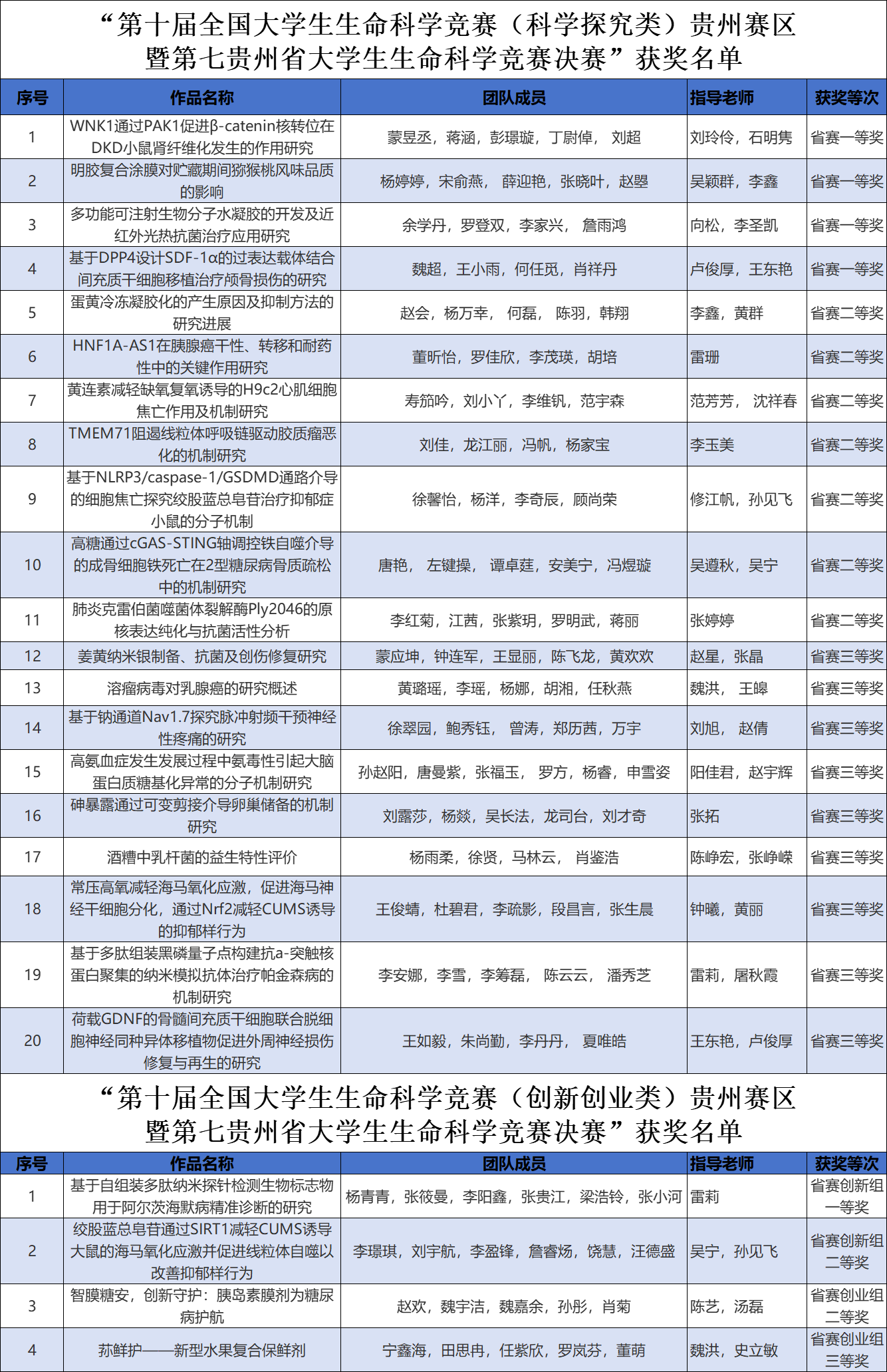 6月21日至22日,第十届全国大学生生命科学竞赛贵州赛区暨第七届贵州省大学生生命科学竞赛在黔南民族师范学院举行,我校有24支代表队,共41名队员参加了现场答辩。经网络评审、现场汇报及答辩、专家评审等环节,我校团队在科学探究类获得一等奖4项、二等奖7项、三等奖9项,创新创业类获得创新组一等奖1项、二等奖2项、三等奖1项。