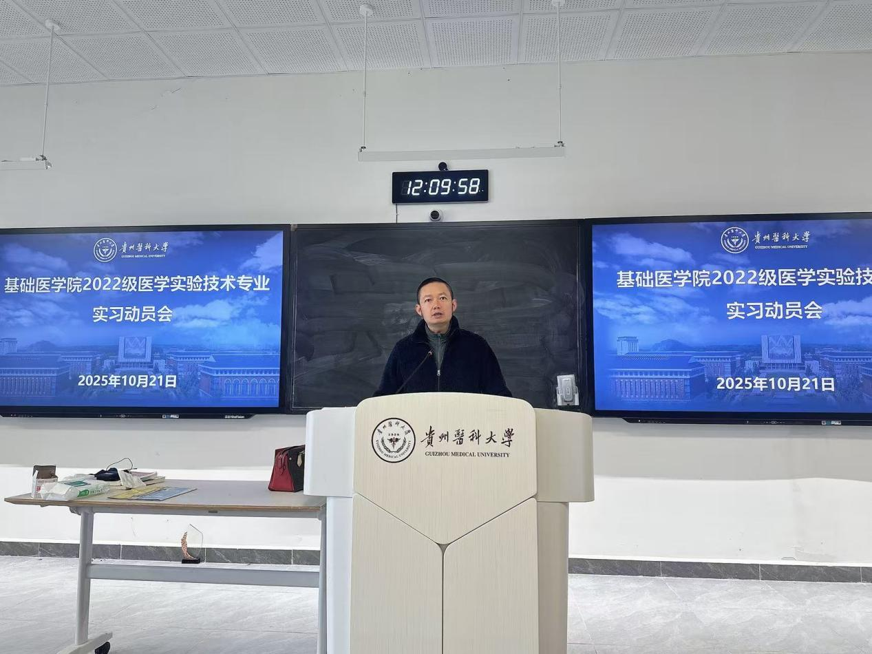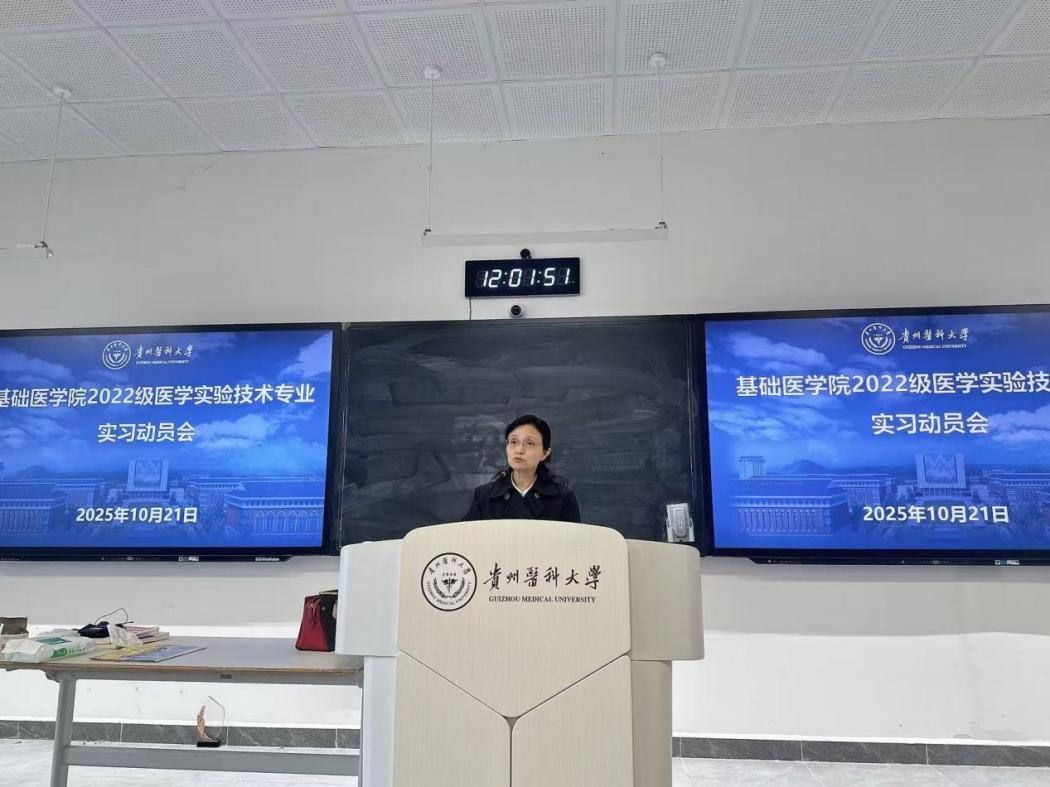 徐红指出毕业实习是理论知识与临床实践衔接的核心环节,培养临床思维与实验创新意识的同时,也是同学们从课堂走向实操的关键过渡,为未来从事医学实验相关工作或参与科研项目打牢实践基础。并特别提醒在医院实习阶段需兼顾毕业论文工作,要求同学们按要求推进毕业论文选题、开题报告、文献综述、英文翻译、中期检查及初稿撰写等关键环节,合理统筹时间,确保实习与论文工作有序衔接、同步落实。希望同学们以严谨务实态度对待实习与论文工作,珍惜实践机会,在实操中锤炼技能、在研究中培养作风,努力成长为医学实验领域高素质应用型人才。