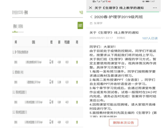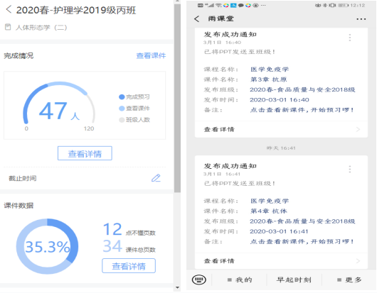 本学期,我院11个教研室、5个实验室承担了基础医学、临床医学、预防、口腔、护理、影像、儿科、麻醉、食品卫生与营养学、医学实验技术等25个专业共计373门课程,学生达36000人次。3月2日是开学的第一天,我院有65名教师充分利用各类在线工具,以学堂在线“雨课堂”和超星“学习通”网络教学平台为基础,结合QQ、腾讯会议、钉钉等其他在线工具,通过线上自主学习、网络教学等方式创新教师授课、辅导、课程作业、考试考核等教学环节,数千名师生虽然身处异地,通过线上教学井然有序地开展各项教学活动。