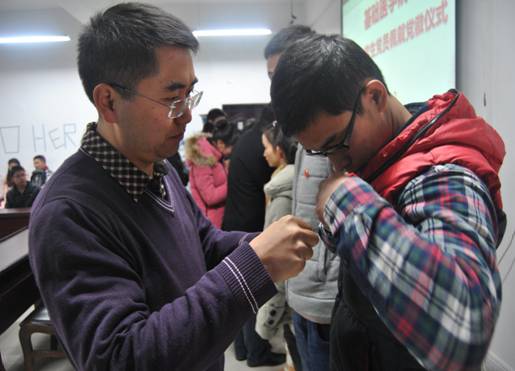 首先,党委副书记廖兴江对本次活动进行了介绍,他强调了党员佩戴党徽的重要意义,阐述了诚信对党员的重要性,最后希望学生党员能在期末考试中亮明身份,诚信应试,做好示范。全体老师为新党员佩戴了党徽,并由学生科老师带领学生党员重温入党誓词。最后党委书记徐国强为本次活动进行了总结。徐国强书记指出,入党是神圣而光荣的,是政治生命中最重要的事。希望学生党员对自己严格要求,充分发挥先锋模范作用,做好党建团建工作。